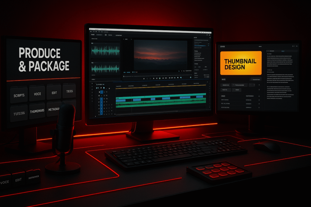 We handle scripts, voice, edit, titles, thumbnails, and metadata.